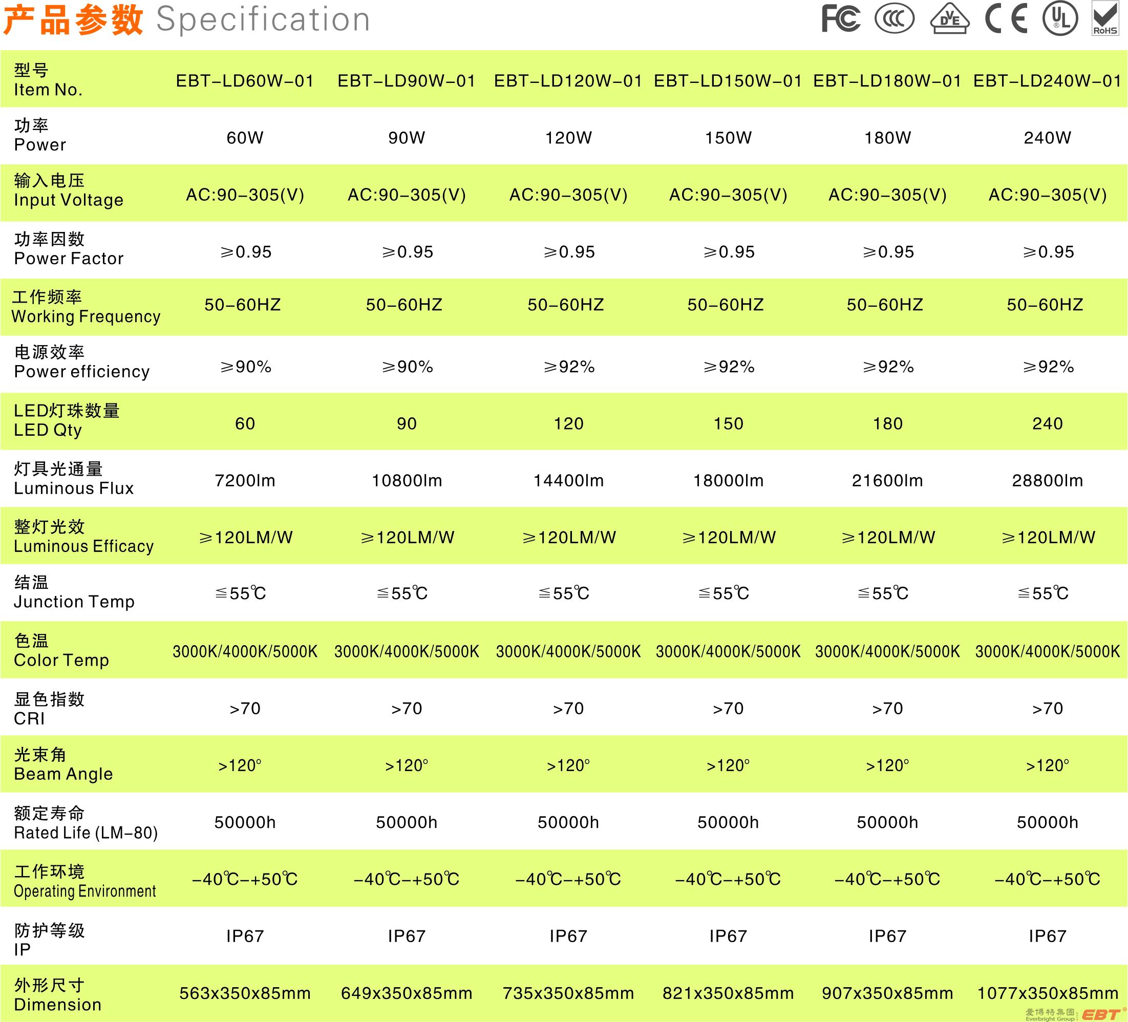 產品描述:采用國際知名品牌芯片,高亮度,低光衰; 防水防塵防腐蝕; 采用通孔結構散熱,使用壽命長; 科學配光,適用多種場所。